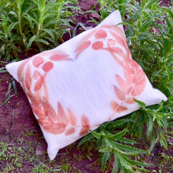 Cojín de lana merino, hecho a mano y estampado con diferentes hojas de eucaliptos dando forma de corazón.