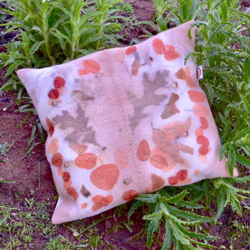 Cojín de lana merino, hecho a mano y estampado con hojas de roble y eucaliptos además de trozos de cáscaras de cebolla amarilla y morada. Mida 40x34cm.