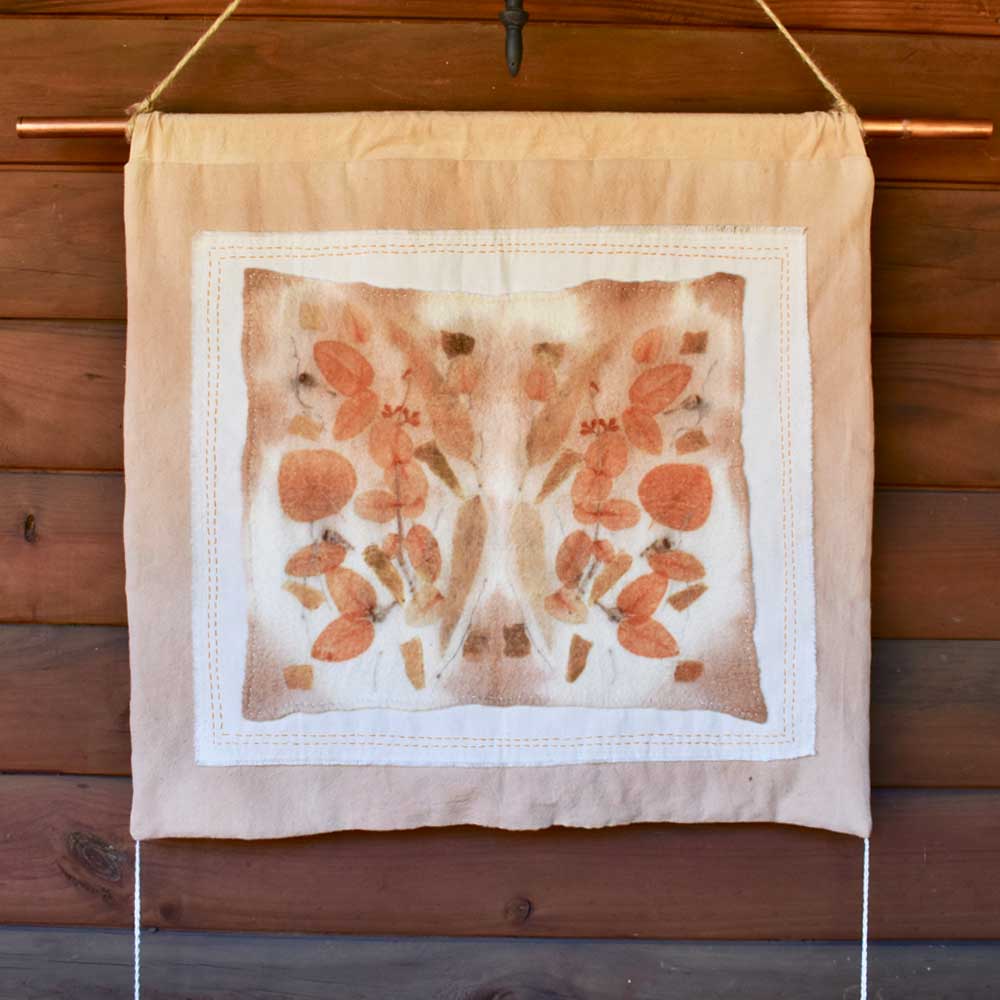 Estampado botánico hecho en vellón de lana Merino y enmarcado en tela de crea y lino con tinte de carozos de palta. Tiene 2 borlas de hilo de algodón hechas a mano.
