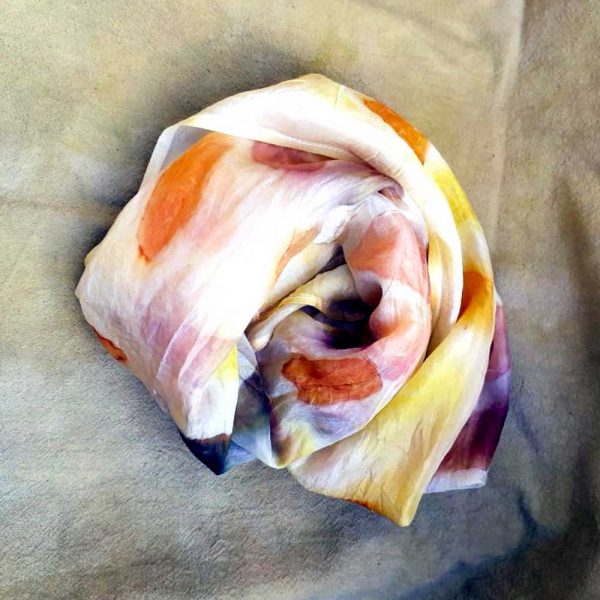 Hermoso pañuelo de seda natural, estampado utilizando diferentes técnicas con hojas, flores, cáscaras y frutos. Miden 150 x 40cm. Son ideales para complementar una tenida preferida por sus tonalidades sentadoras y naturales.